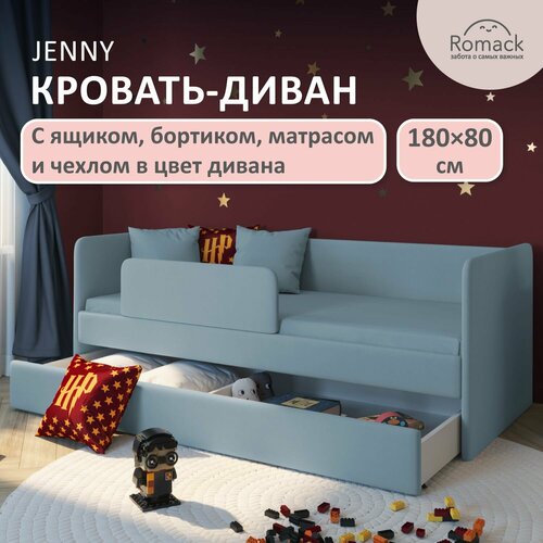 Кровать детская 180х80 см Jenny Голубой, с матрасом, ортопедическим основанием, защитным бортиком, чехлом на матрас и ящиками для белья.