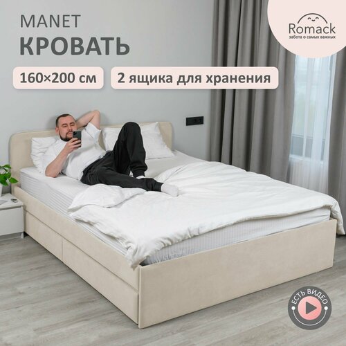 Кровать двуспальная Romack, 160х200 Manet Светло-бежевая микровелюр, с выдвижными ящиками (2 шт) и ортопедическим основанием.