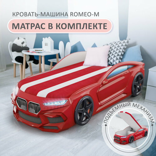 Кровать детская машина Romack Romeo-M красная, с подсветкой фар, ящиком для белья, объемными колесами, матрасом 70х170 см в фирменной обшивке