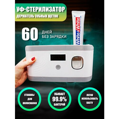 Автоматический дозатор для зубной пасты. Удобный прибор, который также укомплектован держателем щеток. Максимальное количество зубных щеток, которое можно поместить в держателе - пять штук, он подойдет для большой семьи.