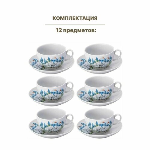 Чайный набор, 6 чайных пар, 210 мл. Дулёвский фарфоровый завод. Форма "Янтарь", рисунок "Гуси". Фарфор.