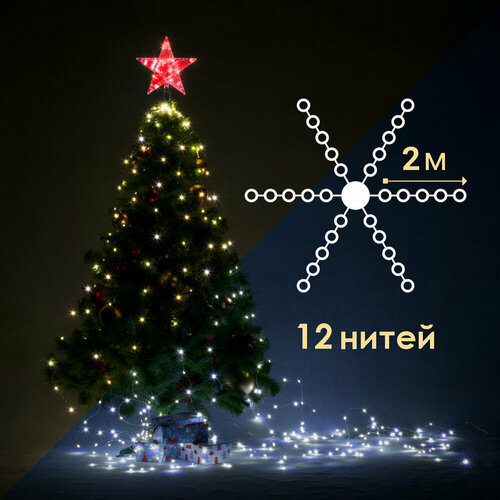 Гирлянда "Лучи", 240 miniLED, 12 нитей по 2м, 8 режимов, низковольтная, теплый/белый