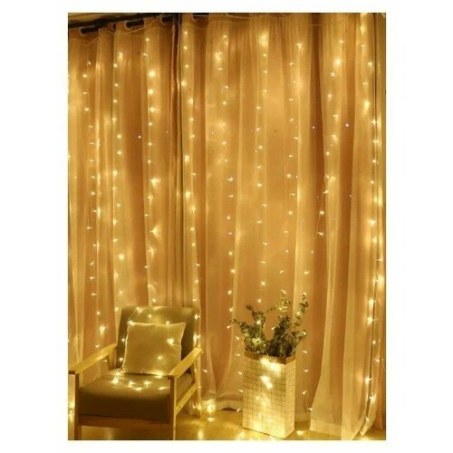 Гирлянда штора, гирлянда штора, гирлянда 3x2, гирлянда занавес светодиодная, теплый жёлтый, прозрачный провод, контроллер, удлинитель 3 метра