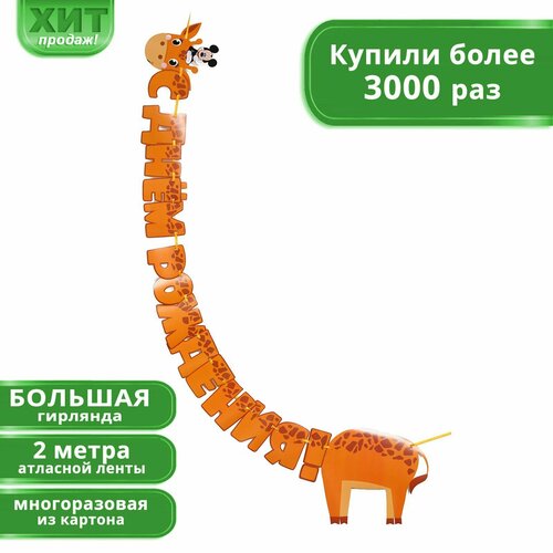 Гирлянда на ленте "С днем рождения", жираф, 2 м, Микки Маус и его друзья