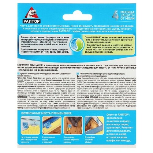 Раптор Саше от моли "Раптор", с ароматом жасмина, набор, 4 шт