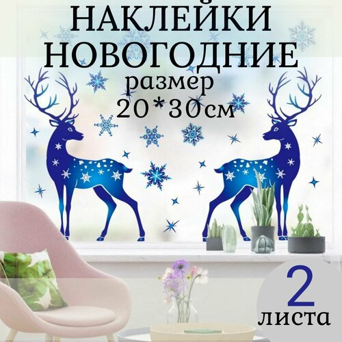 Наклейки новогодние на окна Олени и снежинки, 2 листа 20*30 см