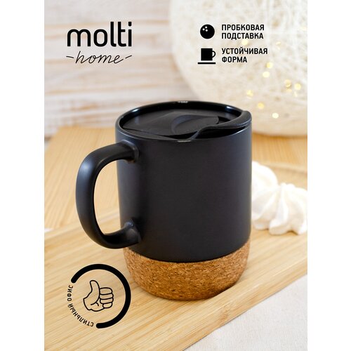 Кружка чашка для чая для кофе с пробковой подставкой, с крышкой для питья Corky Walk, черная