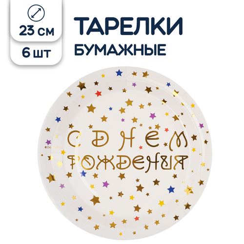 Тарелки (7'/18 см) С Днем Рождения! (золотые точки), Белый, Металлик, 6 шт.