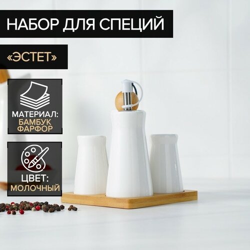 Набор фарфоровый для специй на деревянной подставке, 4 предмета: солонка, перечница, 2 соусника