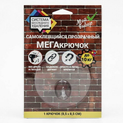 Самоклеящийся прозрачный крючок с системой бесследного удаления 8.5*8.5 см, до 10 кг, 1 шт