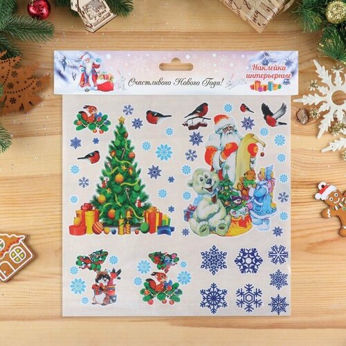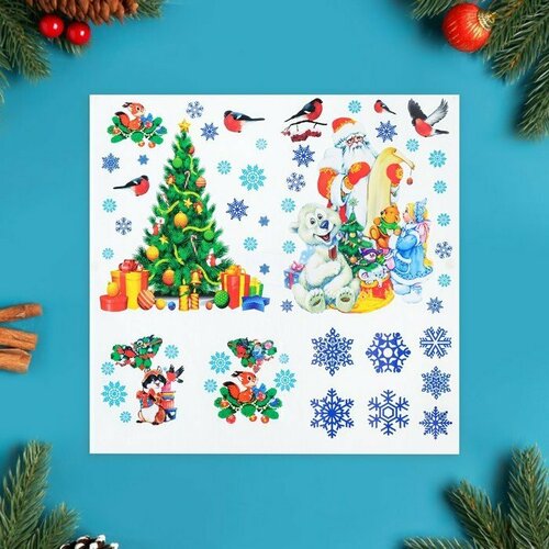 Набор наклеек на окна "Новогодний" ёлочка, снегири, Дед Мороз, 36 х 36 см