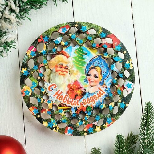 Тарелка сувенирная деревянная "Новогодний. Дед Мороз и Снегурочка", цветной
