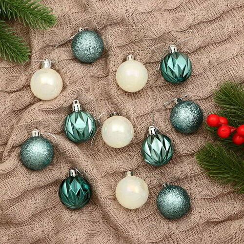 Набор шаров пластик d-4 см, 12 шт "Мелодия" грани блеск, белый зелёный