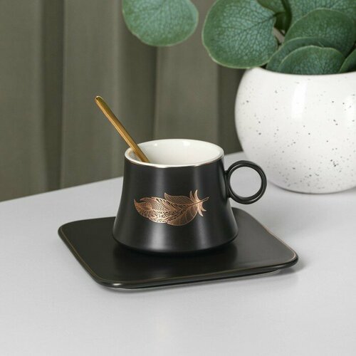Чайная пара керамическая «Лист», 2 предмета: кружка с ложкой 180 мл, блюдце d=13,5 см, цвет чёрный