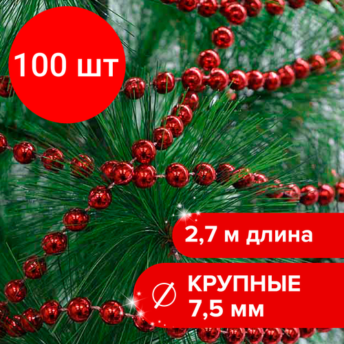 Комплект 100 шт, Бусы елочные золотая сказка, диаметр 7.5 мм, длина 2.7 м, красные, 591137