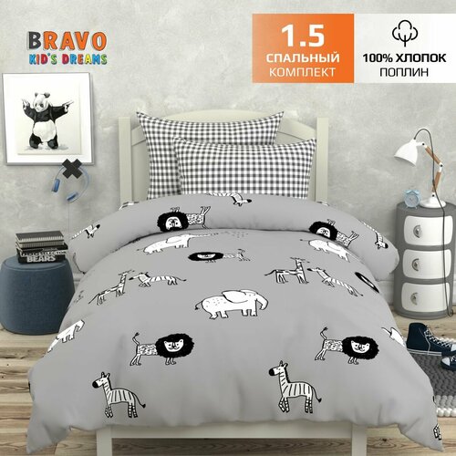 Постельное белье 1.5-спальное BRAVO KIDS DREAMS Мадагаскар / хлопок / поплин / наволочка 70*70 /для детей ./ КПБ 1,5-спальный