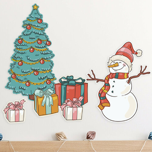 Наклейка новогодняя снеговик с подарками у елки на окно или дверь