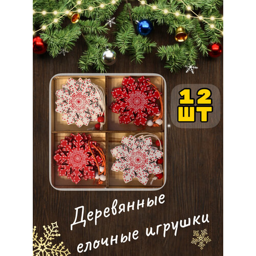 Деревянные игрушки на елку / звездочка, колокольчик, елка, лошадка-качалка, набор 12 шт