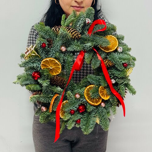 Новогодняя композиция, рождественский венок, композиция из живой хвои, нобилис