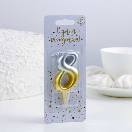 Свеча для торта цифра "Овал" "8", 3,7х7,8 см, золото-серебро