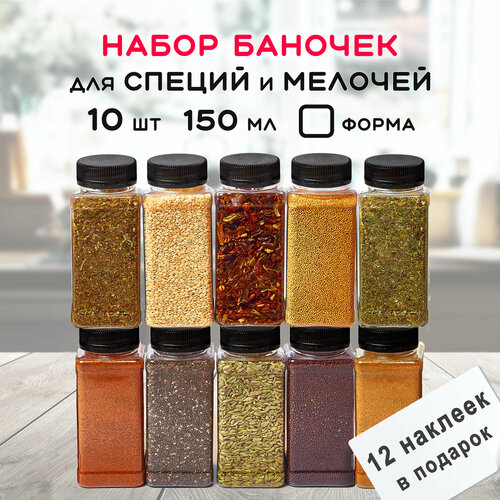 Набор баночки для специй квадратные 150 мл 10 шт. с черными крышками.