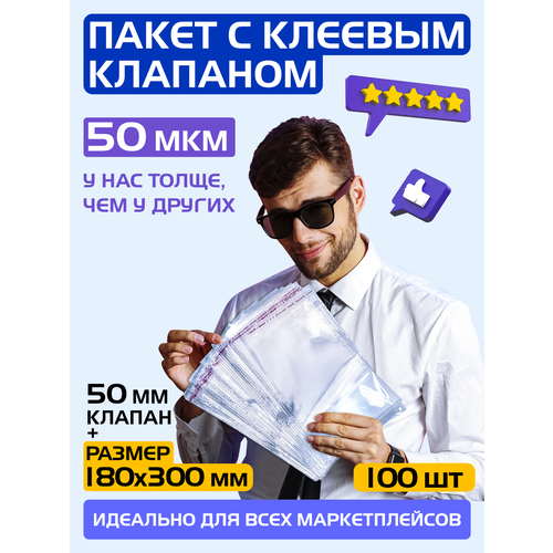 Пакеты упаковочные с клеевым клапаном 180х300 +50 мм, 50 мкм. Комплект 100 штук.