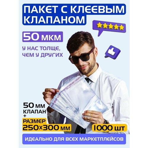 Пакеты упаковочные с клеевым клапаном 250х300 +50 мм, 50 мкм. Комплект 1000 штук