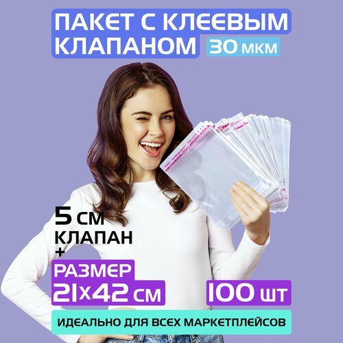 Пакеты упаковочные с клеевым клапаном 21х42 см+5 см для хранения вещей и продуктов, 30 мкм. Комплект 100 штук