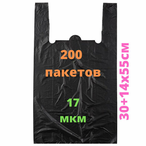 Пакет майка 30+14х55 см, чёрная, 17 мкм 200 шт