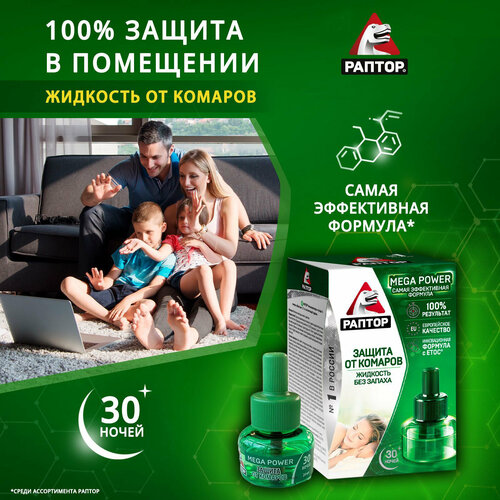 Комплект от комаров повышенной эффективности Раптор Mega Power, фумигатор и жидкость от комаров, 30 ночей