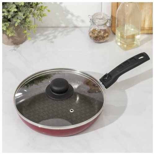 Сковорода «Альфа», d=22 см, съёмная ручка, стеклянная крышка, антипригарное покрытие, цвет бордовый