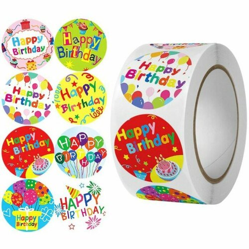 Наклейка бумага "С днём рождения!" d=2,5 см 500 шт в рулоне 3х6,5х6,5 см