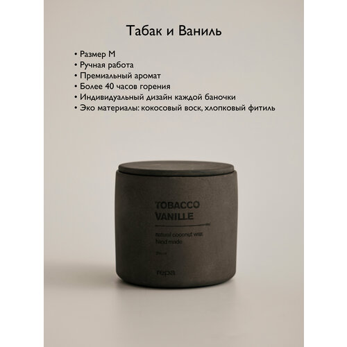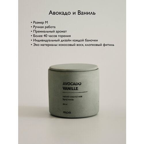 бежевый, черный, белыйАроматические свечи интерьерные "repa home decor"- настоящее произведение искусства. На каждую из них вручную наносится надпись, структура камня пористая - это делает каждую свечу уникальной. Сделаны из премиального кокосового воска - экологически чистого материала. В свечах используется натуральный фитиль из хлопка. Укомплектована каменной крышкой, с помощью которой можно гасить свечу. Свечи станут идеальным подарком, упакованы в крафтовую подарочную коробку и хлопковый мешочек. Объем 400 мл. Ароматы: - Табак и ваниль - наполняет помещение ароматом сладкой ванили и древесным оттенком свежего табачного листа; - Хлопок - аромат свежего белья после сушки на солнце; - Дикая мята - пахнет еще не собранной мятой; Теплый хлеб - сладкий аромат только что приготовленного хлеба. Амбра и Миндаль - миндаль придает сливочность, а амбра - тягучесть. Мягкий, окутывающий, согревающий; Авокадо и Ваниль - нежные зелено-сливочные ноты авокадо с нотой ванили. Обволакивающий и уютный.