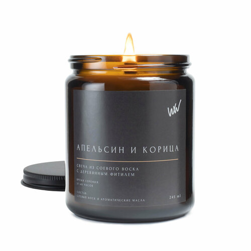 Свеча ароматическая WHALEWAY "Апельсин и корица", соевый воск/деревянный фитиль, 245 m