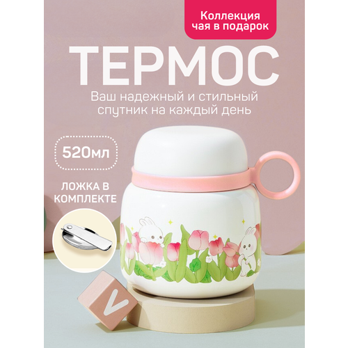 Термос для еды и чая, 520 мл, металлический с широким горлышком и ложкой в комплекте, Зайки