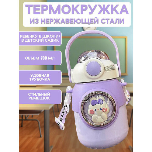 Термокружка для кофе фиолетовая с ремешком и игрушкой, 450мл