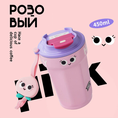 Термокружка для кофе розовая с ремешком и игрушкой, 450мл