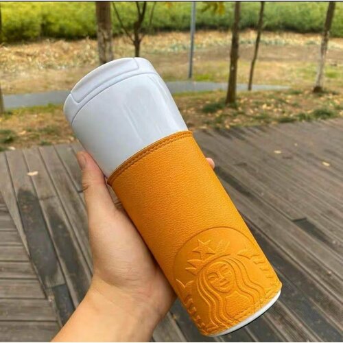 Термокружка Старбакс 473 мл, цвет белый/желтая кожа