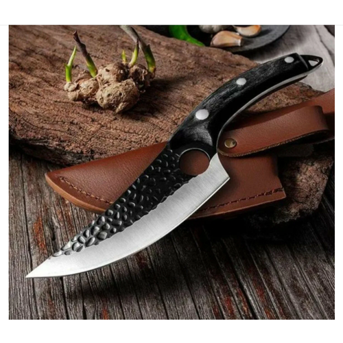 Нож для мясника с черный ручкой и коричневый футляром / Подходит для охоты на открытом воздухе и убоя кожи