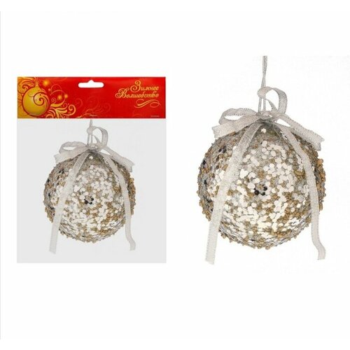 Шар пластик d-8 см "Блеск" серебристо-золотой с бантом блёстки