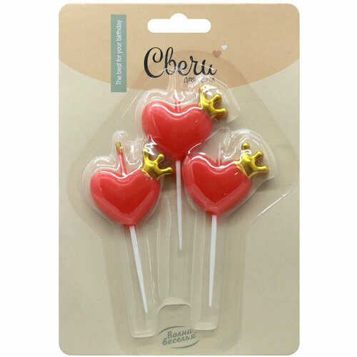 Свечи Сердце, Золотая корона, Красный, Металлик, 3 шт. с держат.