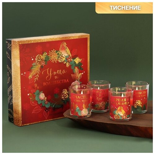 Зимнее волшебство Набор свечей в стакане "Уюта и волшебства", 4 шт, аромат вишня, 22 х 22 х 6 см