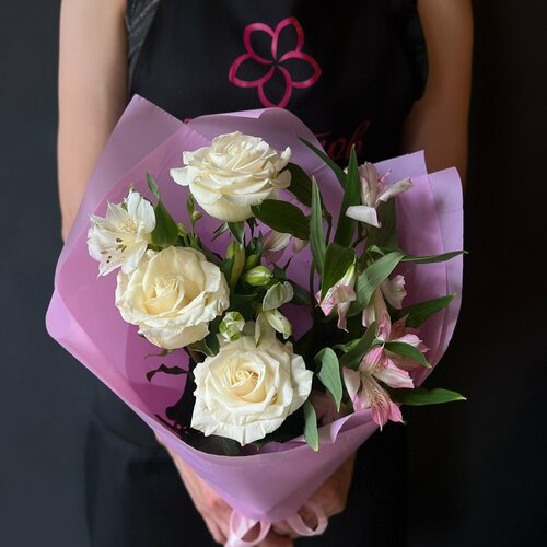 Букет 3 белые розы, 4 альстромерии микс 273342221