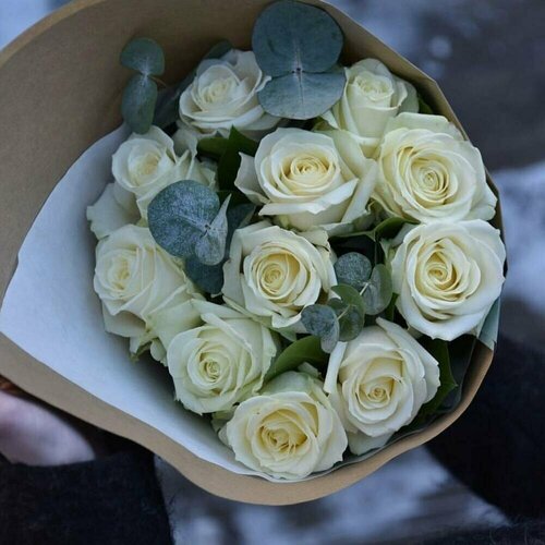 Нежный монобукет для любимых из 11 белых роз с эвкалиптом в крафте. 894536106