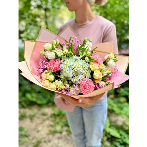 Букет "Голубая Гортензия", альстромерии, гортензии, розы кустовые, гвоздики, гипсофил, эустом, оберточная бумага 101870551439