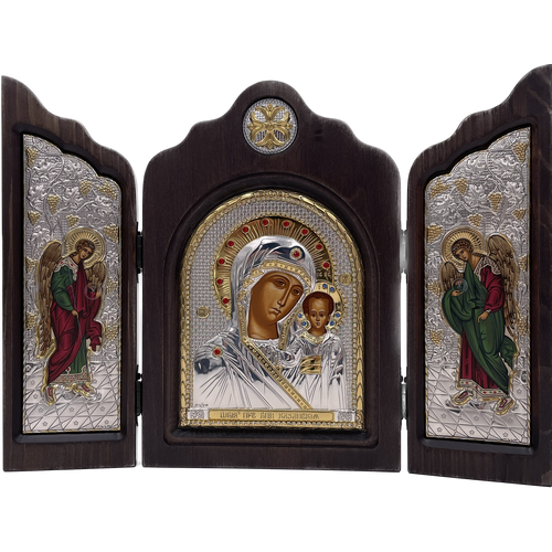 Икона Божией Матери Казанская, триптих, шелкография, золотой декор, серебро, стразы 16*24 см