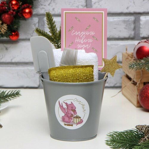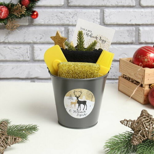 Комплектация: Елочное украшение, Губка для мытья посуды, Кухонная лопатка, Кулинарная кисть,Открытка, Полотенце кухонное 30х60 см, ткань махра, хлопок 100%.