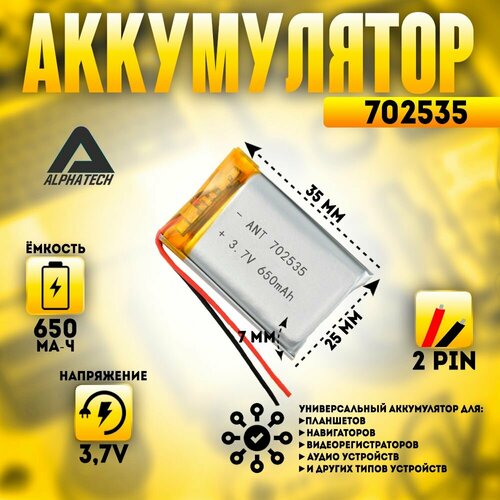 Аккумулятор (батарея) универсальный, Li-Pol, 702535, 7*25*35мм, 2pin, 3.7V/650mAh