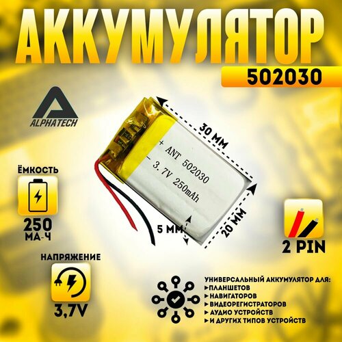 Аккумулятор (батарея) универсальный, Li-Pol, 502030, 5*20*30мм 2pin 3.7V/250mAh