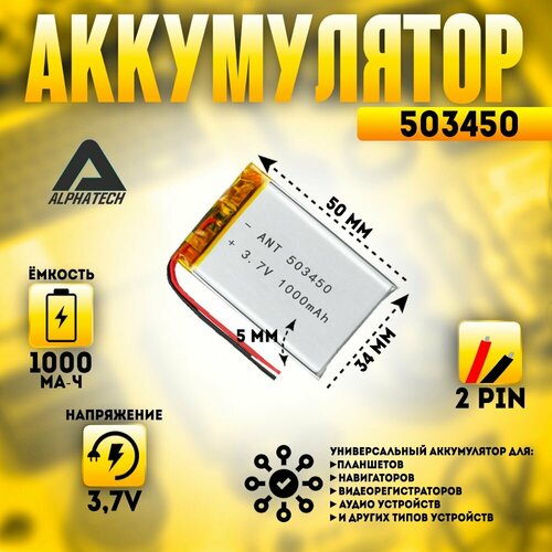Аккумулятор (батарея) универсальный, Li-Pol, 503450, 5*34*50мм, 2pin, 3.7V/1000mAh